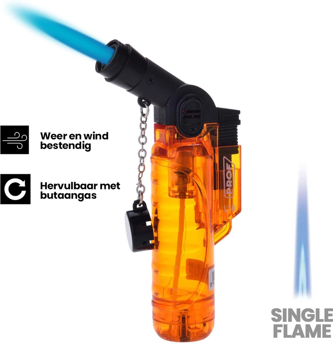 GASREGELAAR: Deze gasbrander beschikt over een gasregelaar. Daarmee kan jij perfect de gas toevoer en dus ook de hoogte van de vlam regelen. Wij raden altijd aan om hem in het midden te zetten zodat je optimaal gebruik maakt van je aansteker.